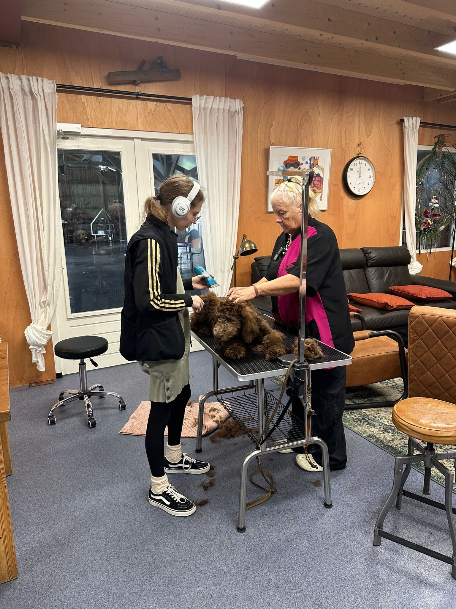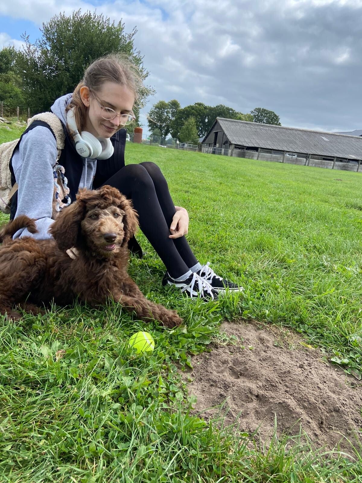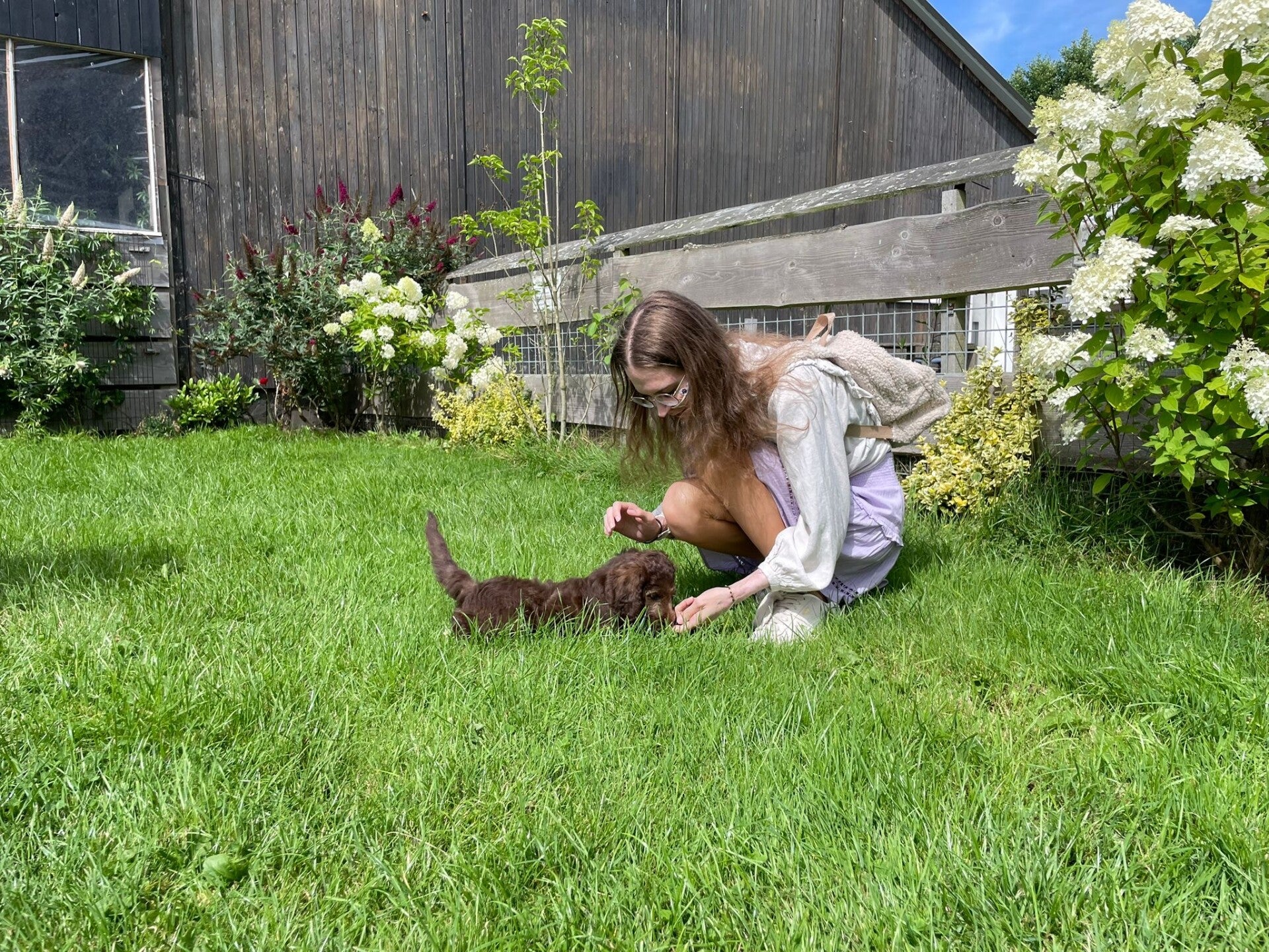 Foto-album over aanpassing in de tuin, (plaatsing) mantelzorgwoning en hulphond; Jessye